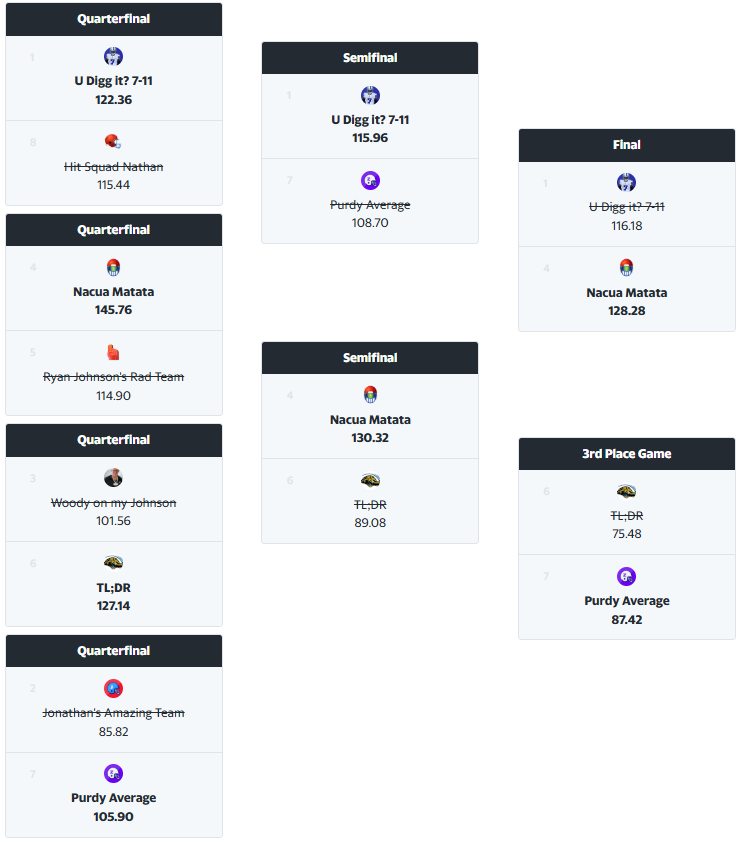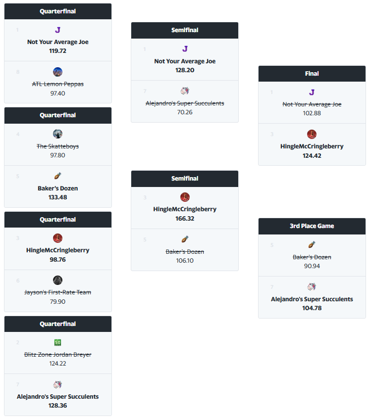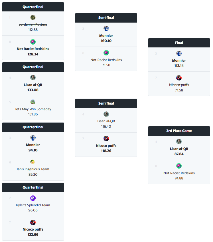 Long overdue: a quick rundown of some of the most noteworthy teams and managers, followed by a final view of the playoff brackets.