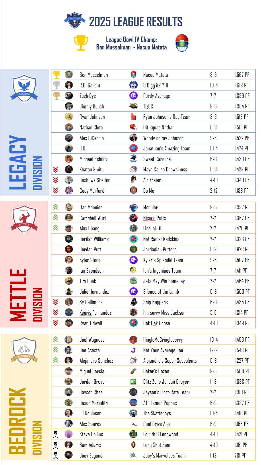 Really solid breakdwon of the season. That Mettle Division stat is crazy tbh - the fact that the five worst-scoring teams somehow grabbed four of the top spots feels like a glitch in the matrix. I had a similar thing happen in my league last year where a guy with the lowest PF stumbled into the finals and actuallt won on the back of lucky matchups. Makes me wonder if there's something systematic going on with how parity works in mid-tier leagues, or if its just pure chaos.