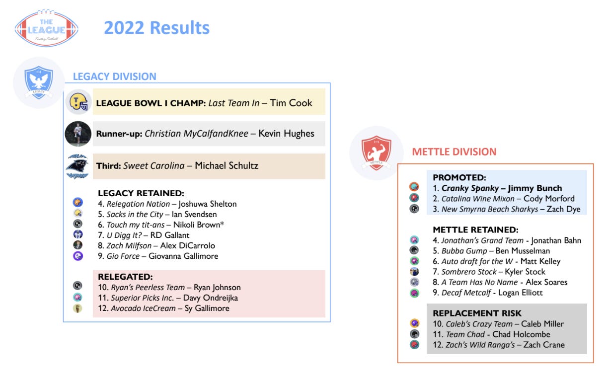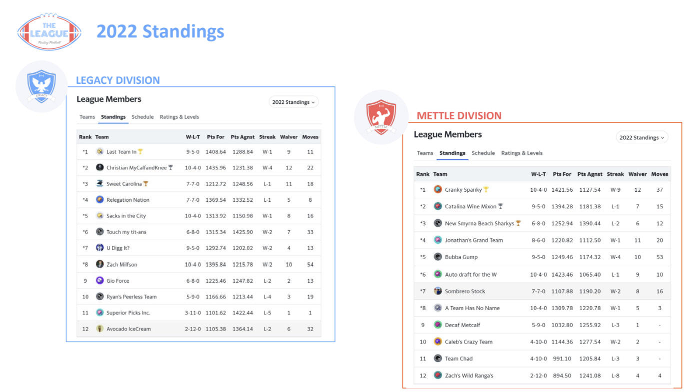 This system works. The folks that didn’t play (evidenced particularly by the far right column of the Mettle Division standings below) all finished last and face possible expulsion from the league. Legacy Division saw a 9th seed race to avoid relegation come down to the final week. The league overall was competitive. No teams cracked 11 wins, and despite my best efforts, no team had less than 2 wins.