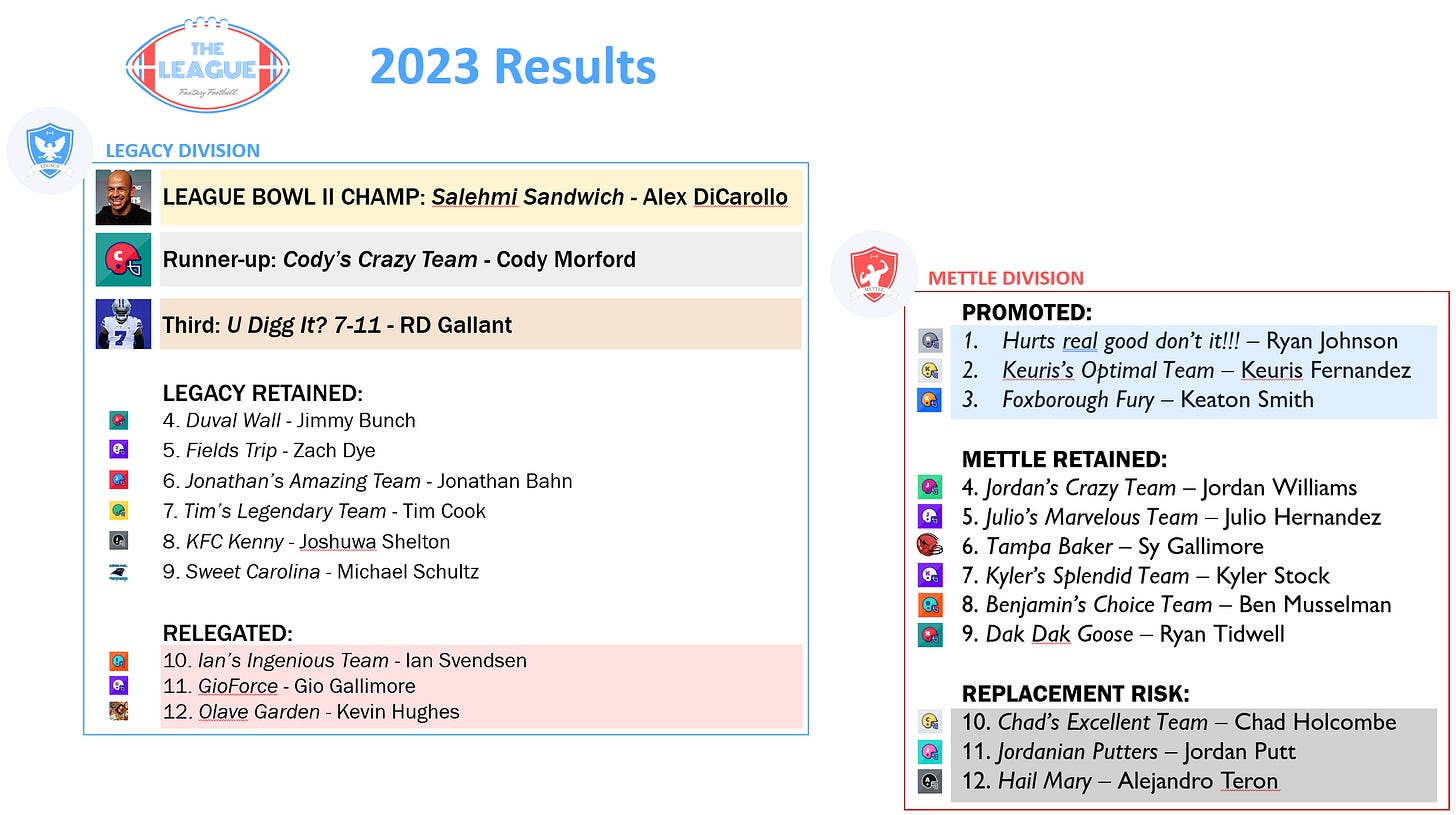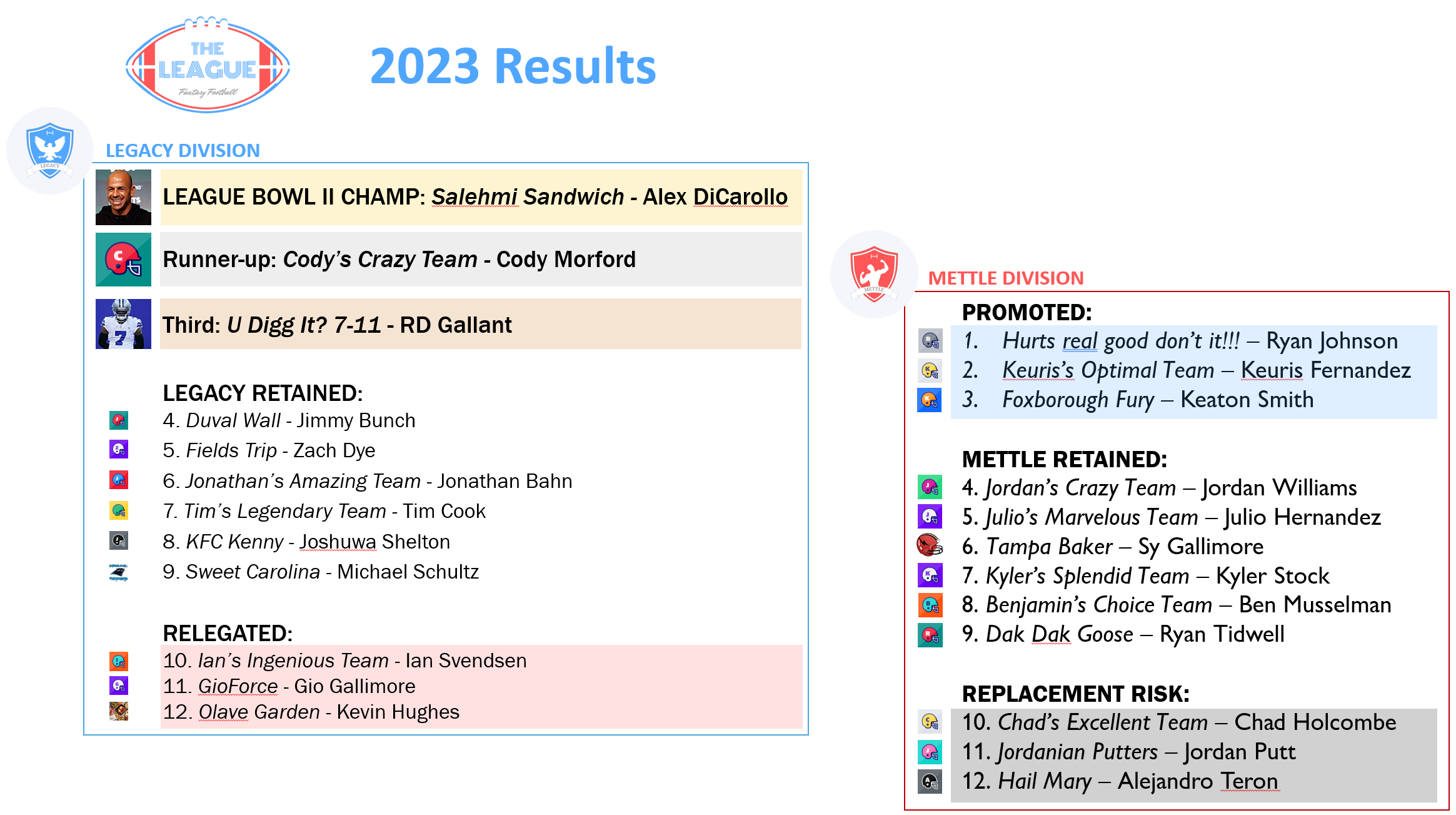 That includes our second-ever champion of the Relegation League, Alex DiCarolo & New York Salehmis. Earrning promotion: Ryan Johnson, Keuris Fernandez, and Keaton Smith.