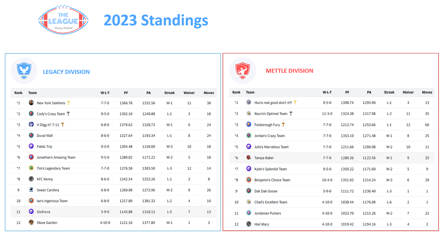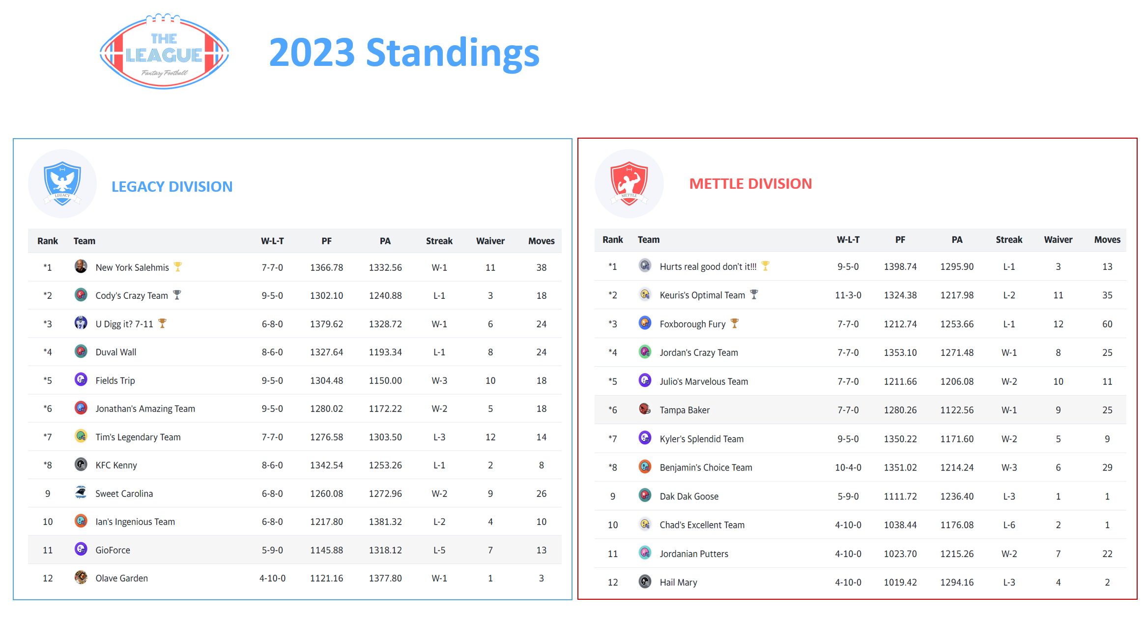 Our first season experiencing the shifts of the relegated and promoted teams proved to bring a new level of excitement. The leagues were even more competitive than our inaugural season. This was especially true in our top tier, Legacy Division, where all teams landed between 9-5 and 4-10 records. In the end, though, the story was similar to last season, with the .500 teams and worse earning trophies and promotion bids.